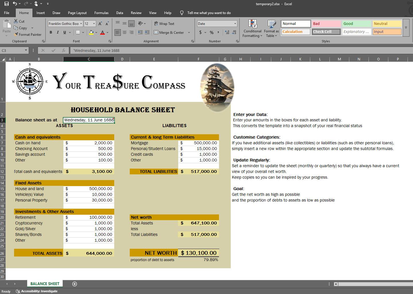 By downloading the Your Treasure Compass balance sheet template all you need to do is enter the date and then enter the values into the white cells to calculate your net worth.