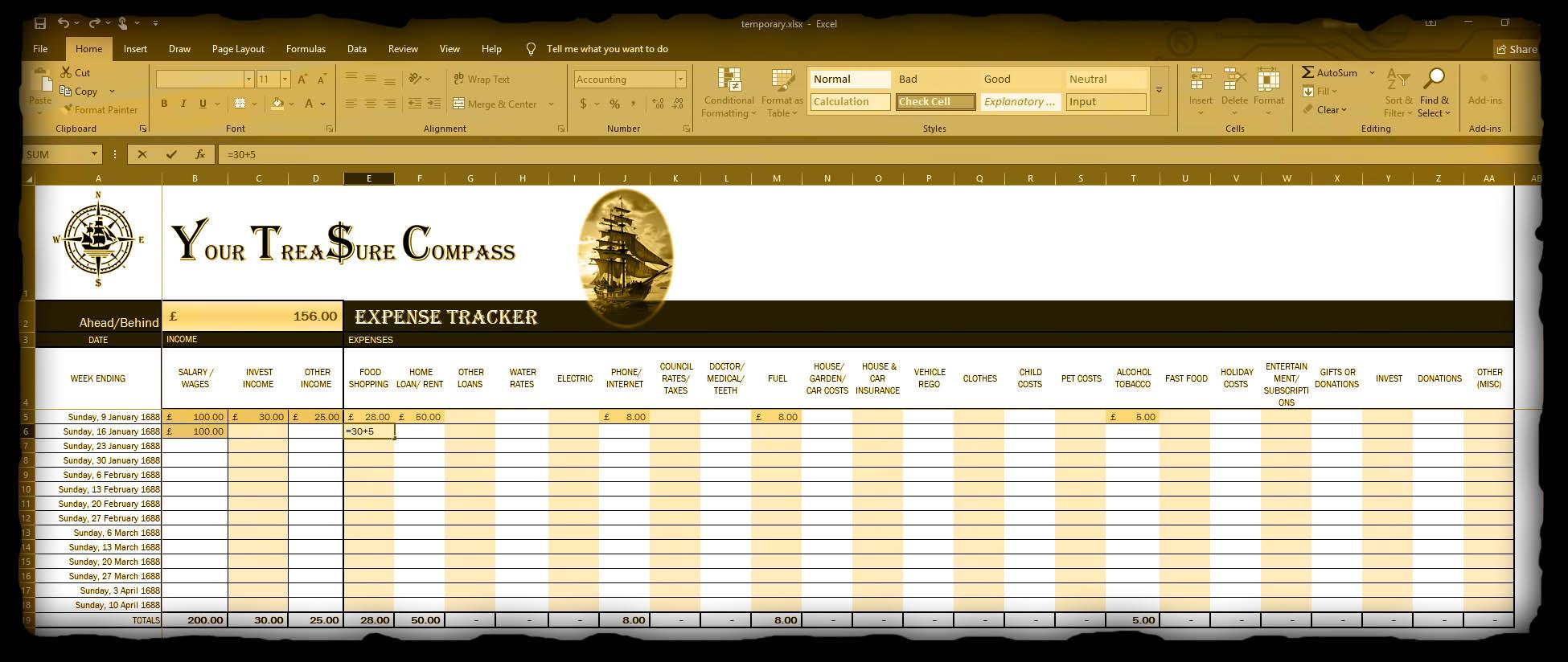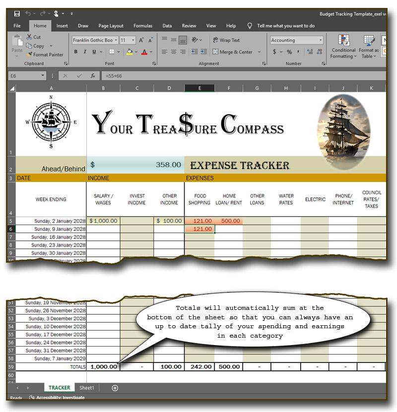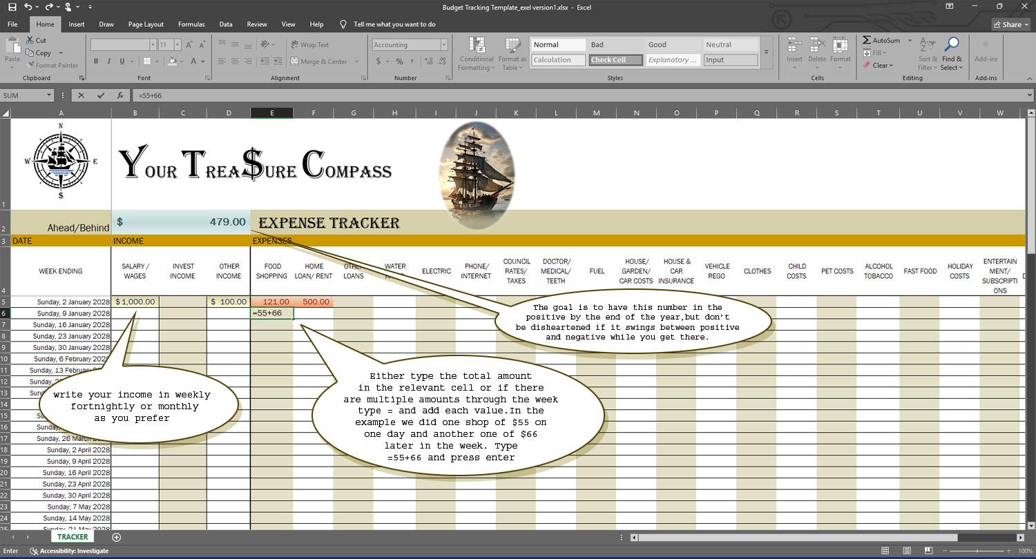 As you discovered on Budget Island, in order for us to chart a course you absolutely need to track everything. It’s a pain but the payoff is immense. Your Treasure Compass has provided you with the resources necessary to get started. The most important tool is the expense tracker. It is a simple spreadsheet that you will open EVERY SINGLE DAY! In it you will record what you have spent for that day to the penny. If you miss a day, you will make sure to catch up as soon as is possible. Your future success is wholly dependent on this. If you achieve nothing else, achieve this daily. You’ll make it your most important habit and never stop.